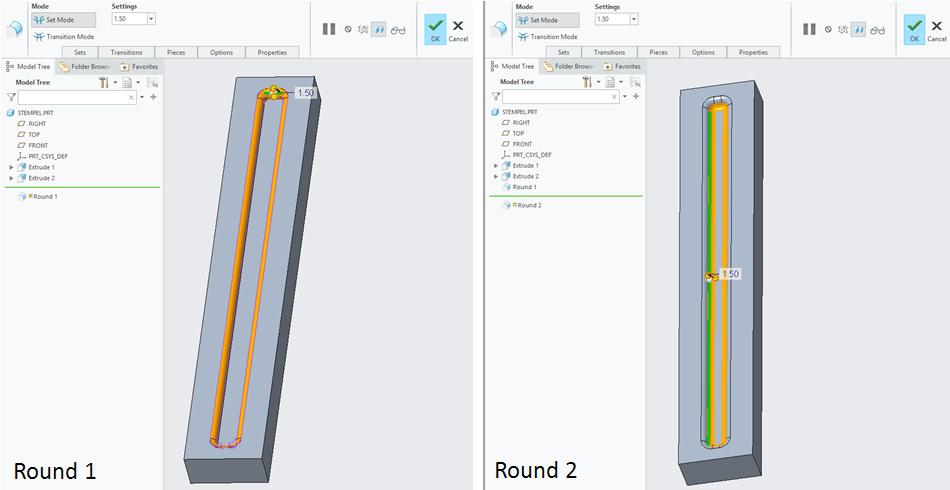 Click on “Die Form” icon and CREO will ask you to point the which file to be used to generate the new feature. Do the setting steps as shown below: