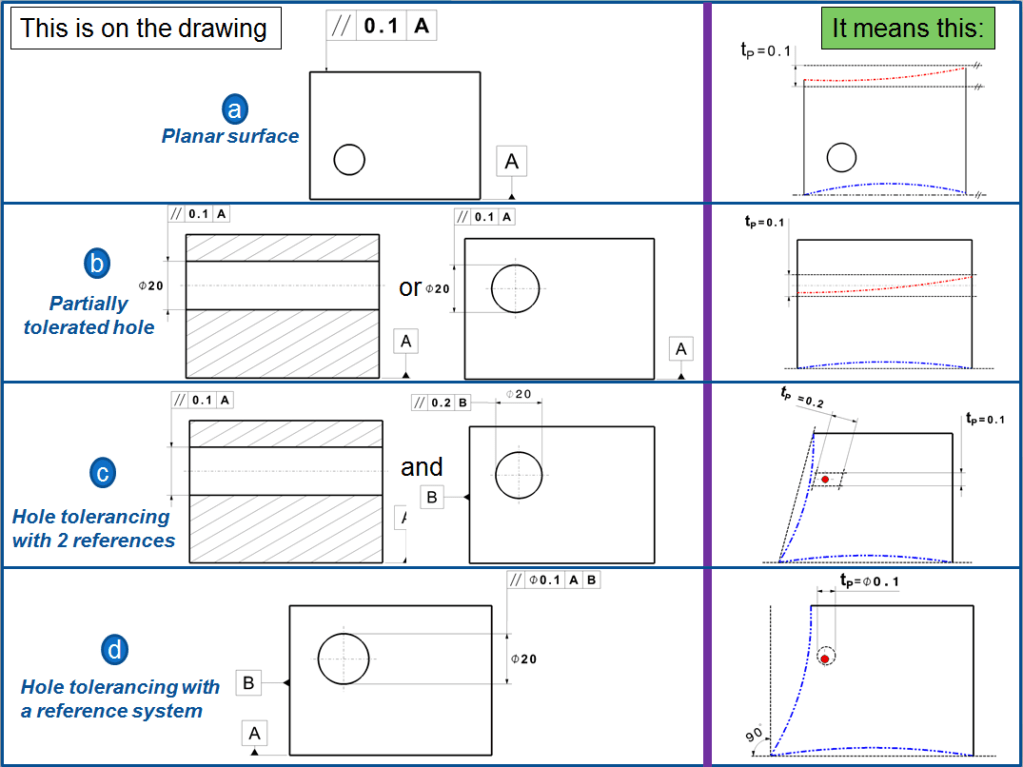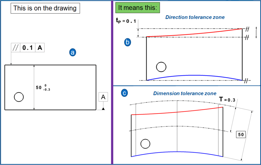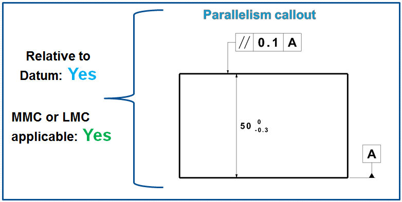 NOTE: The rules applied for parallelism tolerance are also applied to the other direction tolerances (perpendicularity & angularity) and partially to location tolerances (position, concentricity & symmetry) as well.