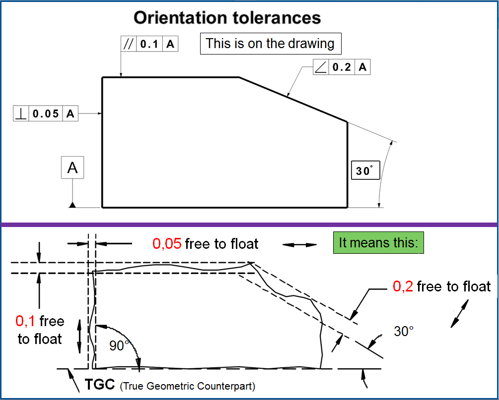 When you create a part as CAD data sure you can create a beautiful animation and virtually your part is perfect. But if you also intend to produce it, then without using GD & T for functional geometrical elements your CAD work remain only a virtual concept of something. It won´t work for real. Therefore you MUST use GD & T rules and define the final concept of your part. Obviously the first elements that you must define are the dimensional tolerances for the functional elements. Then you must continue with the geometrical tolerances of Form and Orientation. It can happen that those Orientation tolerances are not that often used like those of Form, but they are all very important in many cases. About all Form tolerances I´ve already posted how each of these work (in case you want to read about them, just scroll back on my blog and you´ll find all).