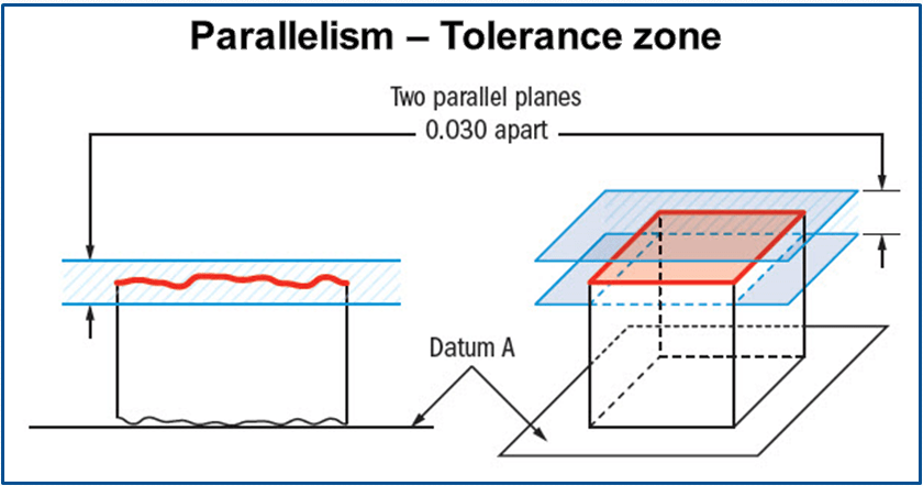 Parallelism Special Note: –Parallelism actually has two different functions in GD&T depending which reference feature is called out. The normal form or Surface Parallelism is a tolerance that controls parallelism between two surfaces or features. The surface form is controlled similar to flatness with two parallel planes acting as its tolerance zone.