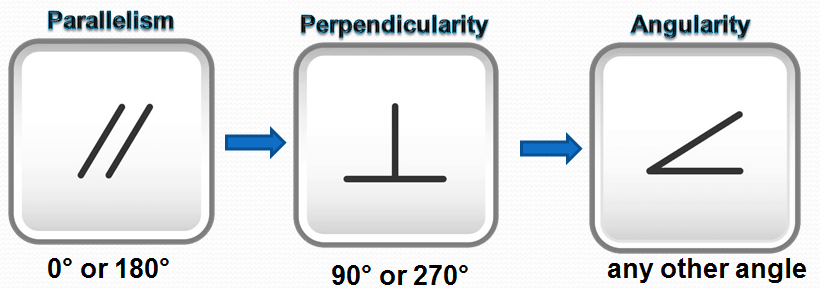 All three symbols work exactly the same. The only difference is that where the “angularity” symbol is used, a basic angle shall be explicitly specified. Where the “parallelism” or “perpendicularity” symbol is used, the basic angle is implied by a drawing view that shows the parallel or perpendicular relationship. Though a single generic “orientation” symbol has been proposed repeatedly, most users prefer separate symbols for parallelism and perpendicularity because each tells the whole story at a glance.