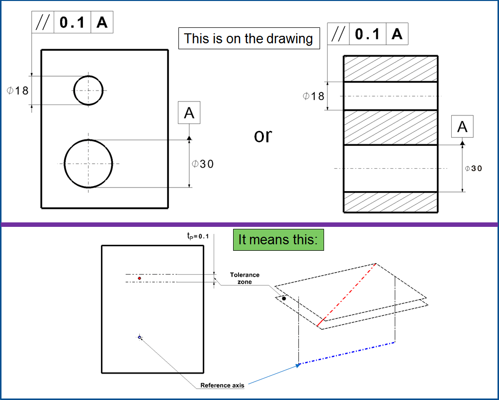 It is important to determine what the reference feature is (surface or axis) and then what is acting as the datum (surface or axis) to determine how the parallelism is to be controlled. This is an important feature for a numerous mechanical elements such as spacers, guidings, gearing-boxes and many more.