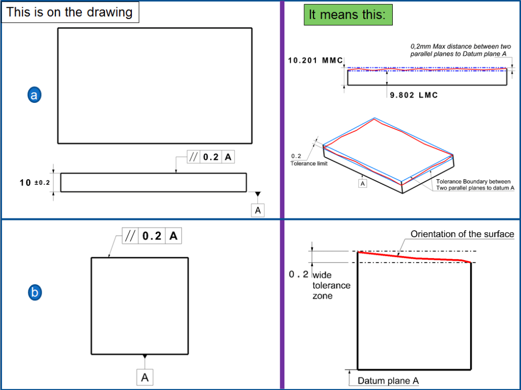 Remember: Parallelism does not directly control the angle of the referenced surface; it controls the envelope (like flatness) where the surface needs to be. The goal is to ensure all points are within a specified tolerance distance away from their corresponding datum points.