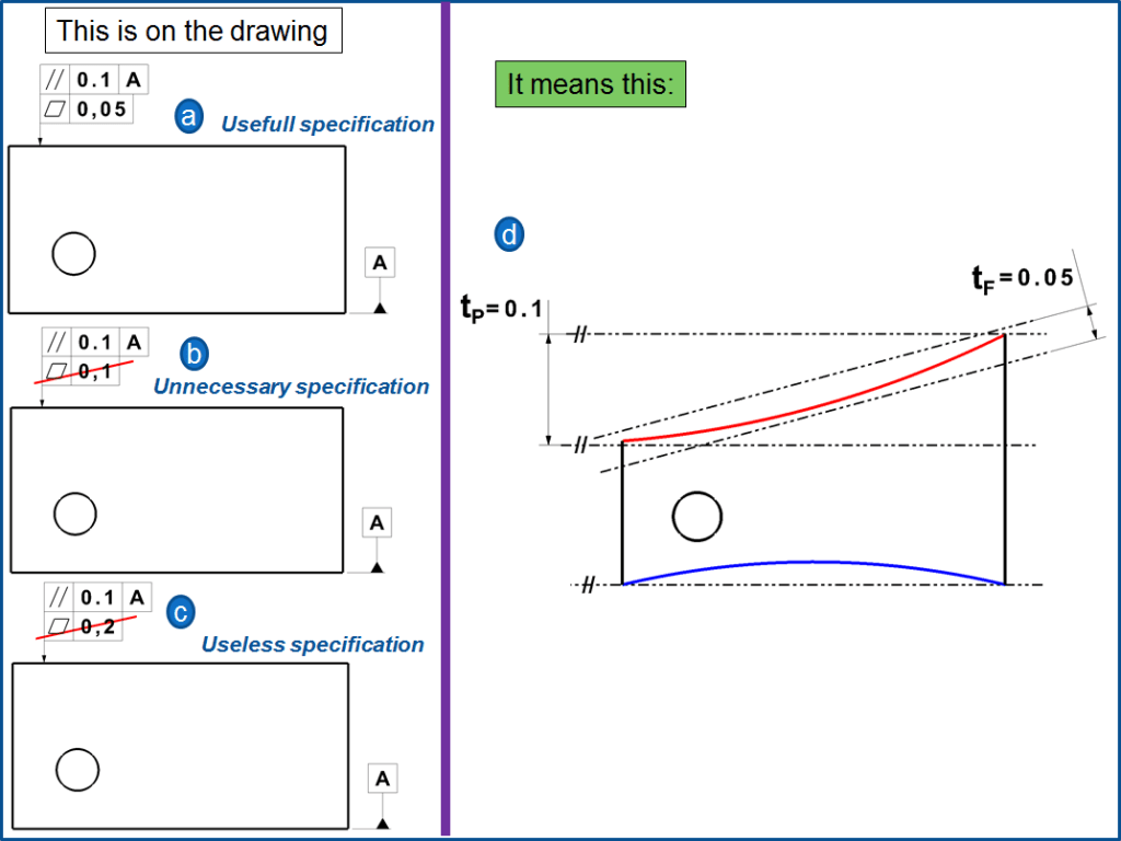 The tolerance zones (d) show the dependence. The tolerance zone for Flatness is slidable and rotable, which is only slidable for Parallelism. (Incidentally, the flatness tolerance zone does not have to be completely within the parallelism tolerance zone). The entry of a form tolerance of equal size like the direction tolerance (b) is unnecessary, which a still bigger form tolerace (c) is senseless. The latter could never be exploited, as the toleranced form element must be between two planes at a distance of 0.1 mm.