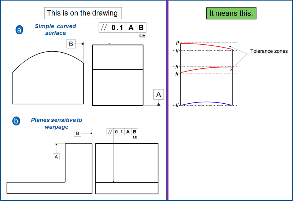 This tolerancing is also applicable on surfaces, fig. 18 -b. The thin lower base tends to warp. That´s why in the parallelism the Flatness is not included, but only the Straightness of arbitrary single lines which run parallel to datum B.