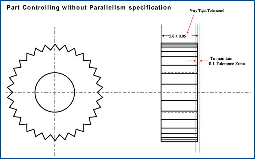 Parallelism Example of use: A gear has to maintain constant axial load on both faces. To ensure even contact one side of the gear is held parallel to the other side. To do this without parallelism, (as shown in fig.8) the gear width would have to be tightly controlled, which could be very difficult to do.