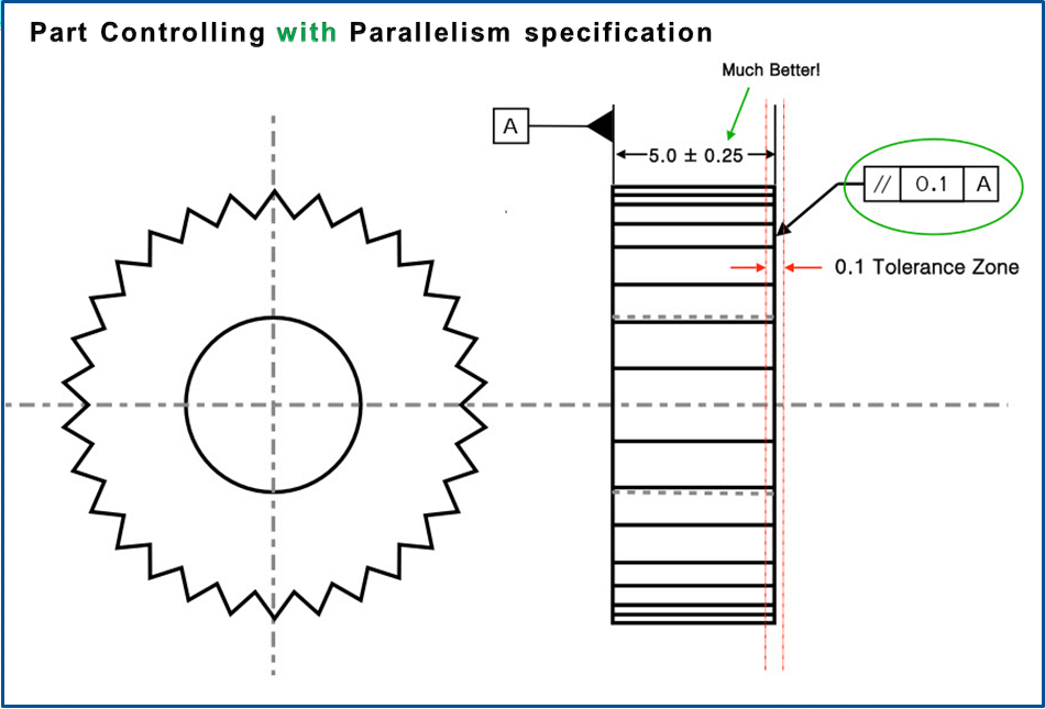 Whenever two surfaces or features need to work in sync with each other and constant distance must be maintained, parallelism is effective. Whenever you have a part that must always fit nicely between two planes that need to reference each other, it comes in handy. Even though surface parallelism seems to ensure that a flat surface is mating with another flat surface, it can also be applied to two sides of a hole or cylinder to avoid a taper. Any part with two critical flat surfaces such as gears would call out parallelism.