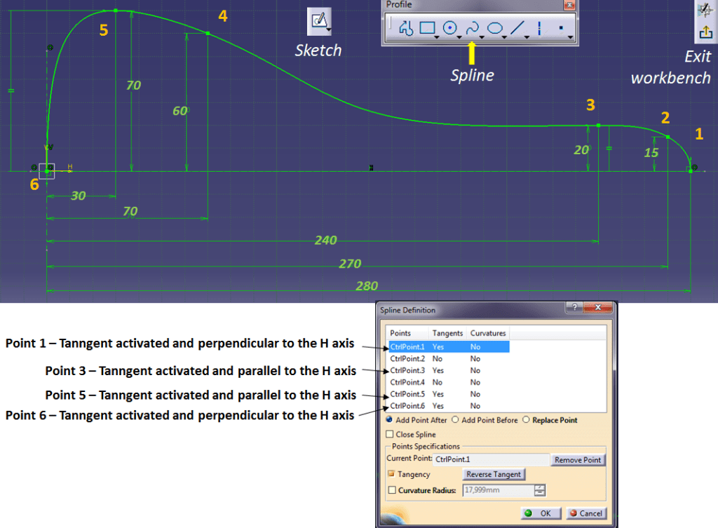 Draw the spline from right to left, activate the tangency for points 1, 3, 5 and 6 and make it fully constrained as shown below:
