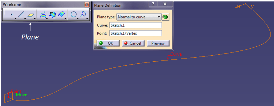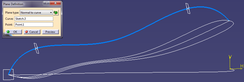 In GSD Workbench click on “Plane” Icon to create a new plane normal to curve at the front point as shown below. This is from now on, the symmetry plane to be used for designing the rest of the part. (You can rename it in the SpecTree you can rename this plane as “Symmetry_Plane”.