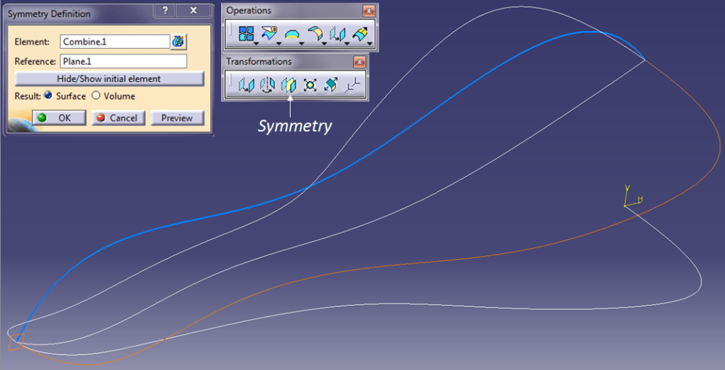 Create the left sidewise profile by making the symmetry of the right side. In Operations toolbar, click on “Symmetry” icon, select the sidewise profile as Element to be symmetrical, choose the symmetry plane as reference and click O.K.