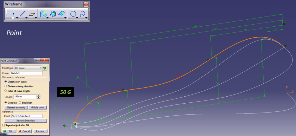 ADVICE: The result found should be similar to the dimensioned sketch. The strak curve is a polynomial of degree 5 and is only fixed once its points positions, its tangents and curvatures have been defined. Since some of these parameters are still free, differences can occur. Especially when points that are close together causing a strong curvature, a subsequent smooth area swings out. Therefore, if further constraints are inserted, then it is possible to optimize the spline in the direction of a balanced, slightly changing curvature. In such a case, it is advisable to: define the curvature at point 1 more precisely with curvature continuity, to optimize the position of point 2 in the creation sequence or to insert an additional tangent in point 3 with a small angle in the direction of width.
