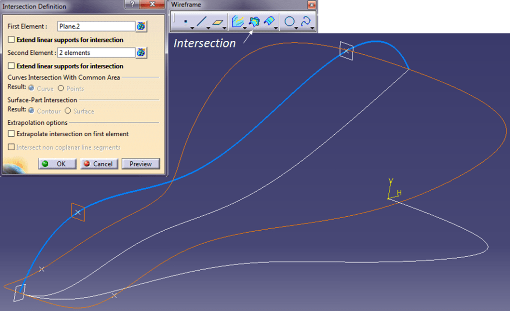 With the 2 previously created planes create the intersection points with the sidewise profiles left and right.In the Wireframe toolbar,click on Intersection icon and select the front plane as First Element and the 2 profiles as Second Element. Do that with the rear plane too.
