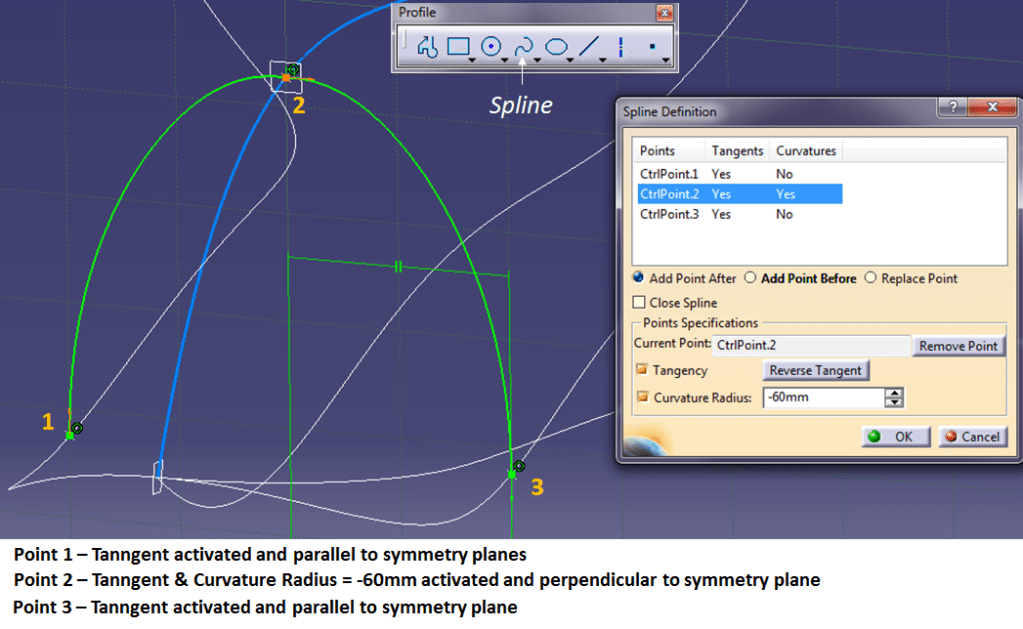 On the Front plane create a sketch using the Spline icon. Draw a spline in 3 points from left to right, activate the tangency for all 3 points and for the point 2 activate also the curvature Radius value at = -60mm. Make both endpoints of the Spline coincident with the intersection points on the reference curves (sidewise and middle curves).