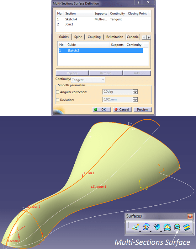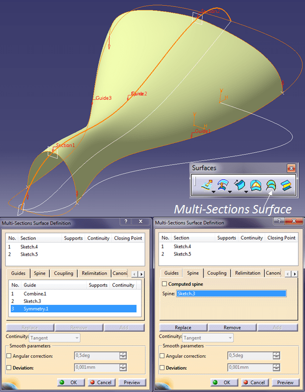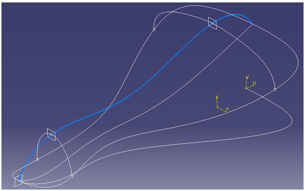 Now, in the SpecTree make the Middle_Body geometrical set active and create the middle surface using the “Multi-Section Surface” function from the Surfaces toolbar. Select the Front and Rear sketches as Sections and for guides use the 2 sidewise profiles and the middle blue curve. Use the Middle curve also as spline and click OK.