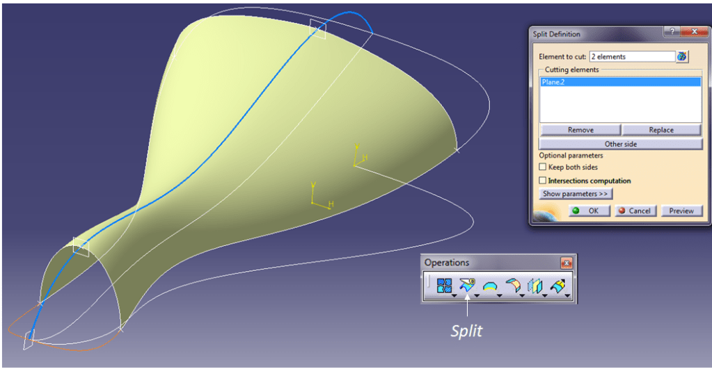 Continue with the surface in the front area. In Operations toolbar, click on “Split” icon and use the 2 sidewise profiles as Element to cut and for cutting element take the front plane and click OK.