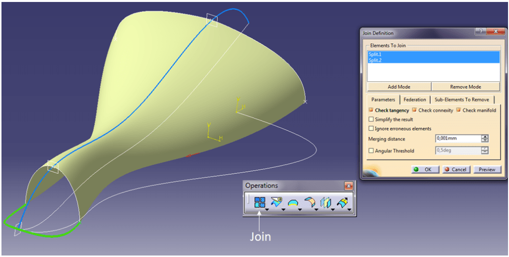 To finish the saddle design and add thickness to the part, all surfaces must be joined in a single surface. In GSD workbench click on “Join” icon from Operations toolbar. Select all surfaces, keep the checking option active and click OK.