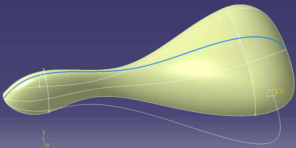 Create the front surface. In the Surfaces toolbar,, click on the “Multi-Section Surface” icon, select the Join curve from Step 17 and the front sketch with its support for tangent continuity linked to Middle surface as Section and use the middle blue line as Guide, then click OK.