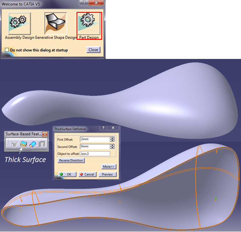 Switch on the Part Design workbench and on Surface-Based Features click on “Thick Surface” icon. Insert a 2mm value for the First Offset and click OK.