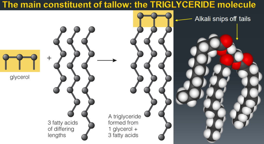 While the Mesopotamians didn´t necessarily use soap to bathe, they did use it to clean wool before weaving it into fabrics. The soap removed the lanolin, a kind of grease, from the wool fibres. But why would you use fat to remove grease? The secret is in the ash water, the Arabic word for which is alkali, which literally means “from the ashes”. Alkalis are the opposite of acids, but both are highly reactive and can transform other molecules. In this case the alkali transforms the fats. One of the main constituents of tallow, is a molecule called a triglyceride. This has 3 tails that can be snipped off using alkali.