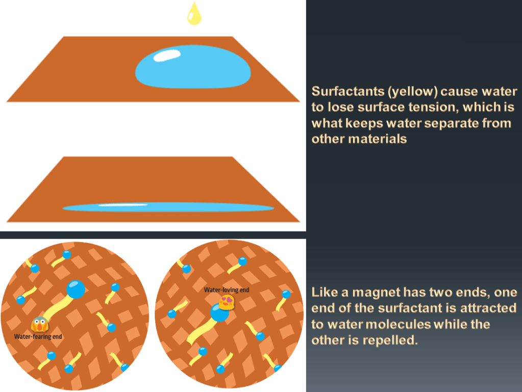 Surfactants change how water behaves. When a surfactant is added, the surface tension is reduced. Now water can spread out and wet the surface (e.g., clothes, dishes, counter tops) we are trying to clean. Now let’s look at what happens on the surface.