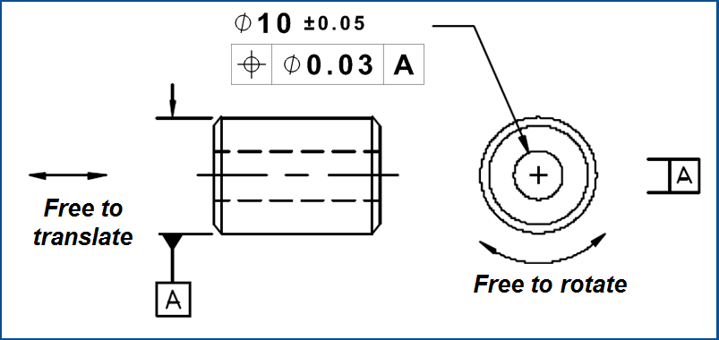Datums for Positional Control – One of the chief advantages of a GD&T positional tolerance over plus and minus coordinate tolerances is its relationship to a specific DRF. Every positional tolerance shall reference one, two, or three datum features. The DRF need not restrain all 6 degrees of freedom, only those necessary to establish a unique orientation and location for true position. For example, the DRF established in Fig. 7 restrains only 4 degrees of freedom. The remaining 2 degrees, rotation about and translation along the datum axis, have no bearing on the controlled feature’s true position. Thus, further datum references are meaningless and confusing.