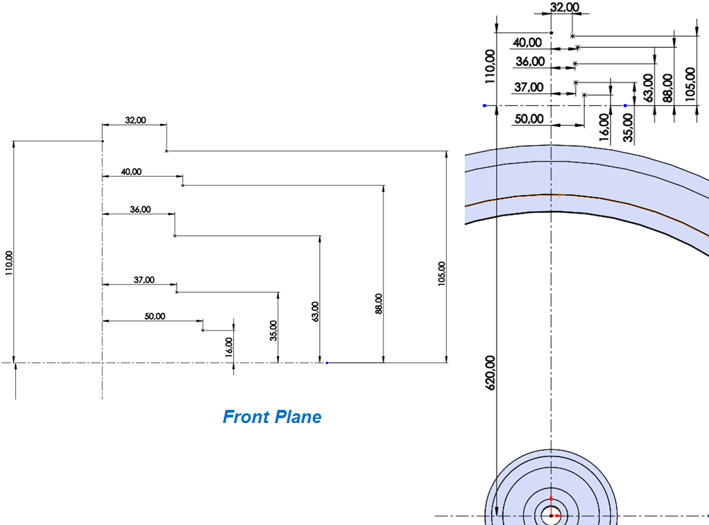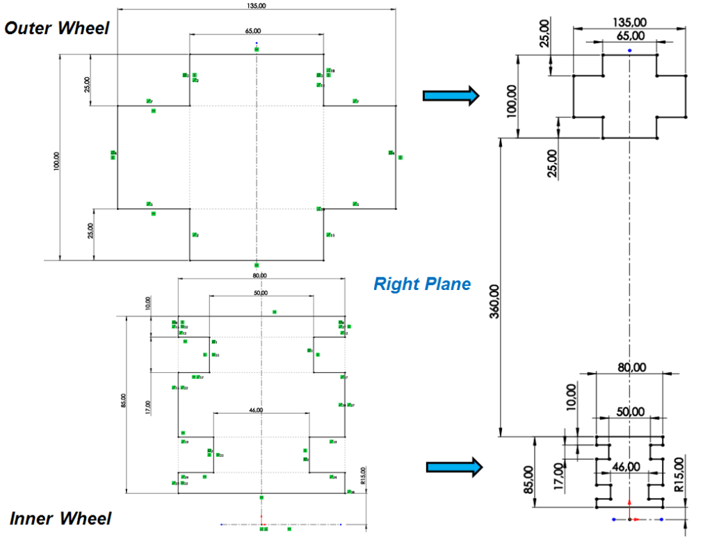 On Right Plane, sketch the 2 profiles for outer and inner wheel at a distance from each other of 360mm as shown: