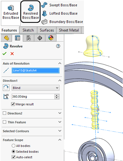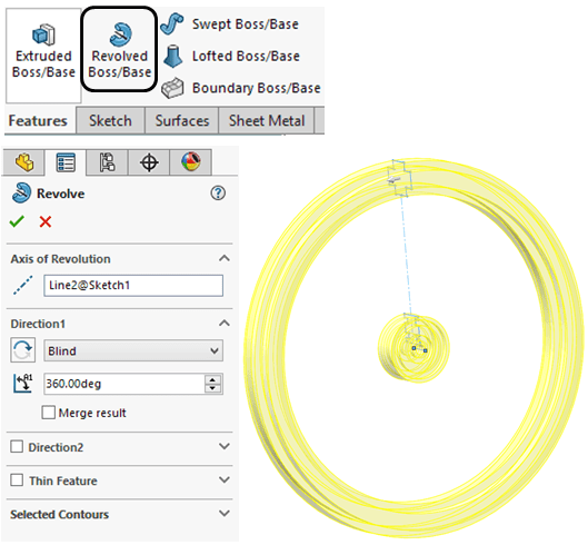 Click on Revolved Boss/Base icon and revolve the previous sketch as shown
