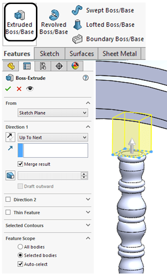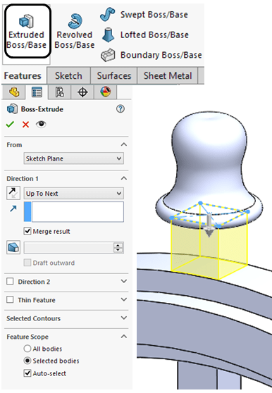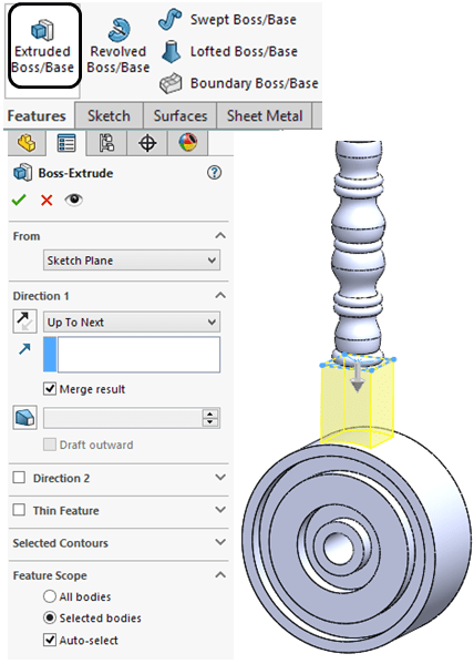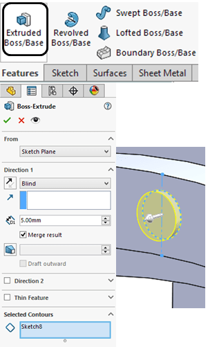 In Features toolbar click on Extruded Boss/Base and extrude the previous sketch Up to Next surface (the inner wheel)