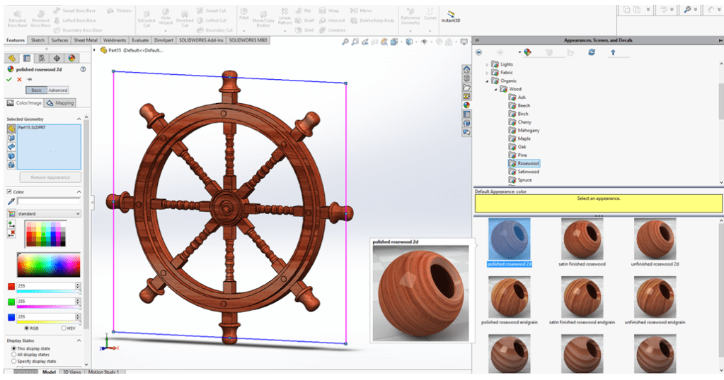 To make the design more beautiful, apply different appearances on it. For instance choose for the enitre part the Appearance as Wood ->Rosenwood –>Polished RosenWood 2D