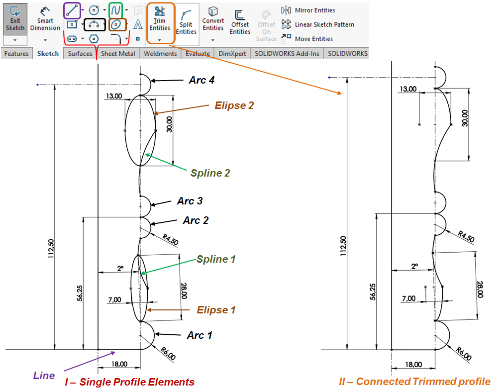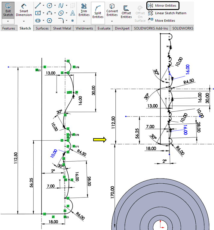 For Handle connect the points defined at STEP 4 and for the Spoke create the profile at a distance of 170mm from the wheel by drawing the bottom-half using line, arc, elipse and spline features, put the geometric constrains and dimensions and except the middle arc, mirror everything on the horizontal middle line as shown: