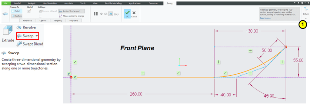 In Model Workbench click on Sweep icon and on the far right click on Datum Icon and create the following sketch on the Front plane.