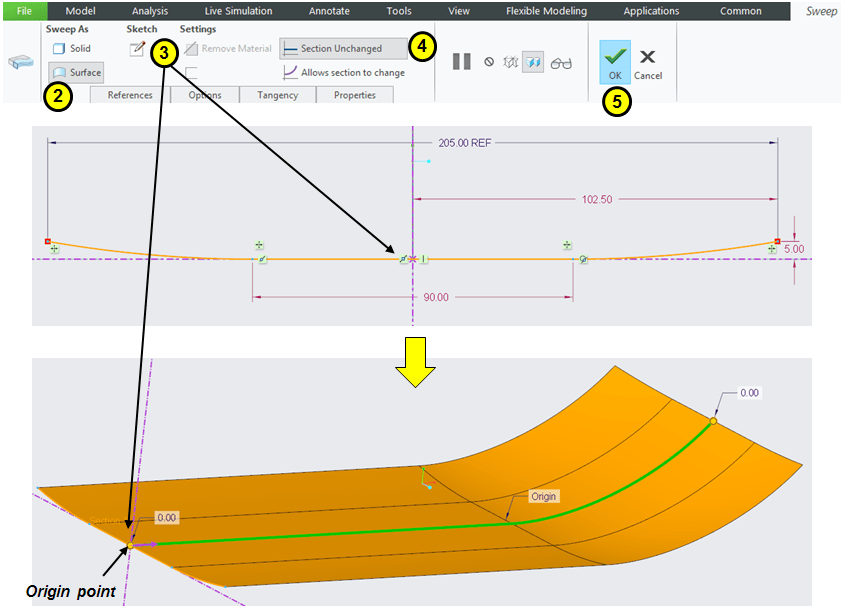 Then select the option to Sweep As Surface, and click on Sketch icon to create the 2nd profile which will be swept along the 1st one. Make sure the Origin Point has the correct position (it must have a purple arrow attached)