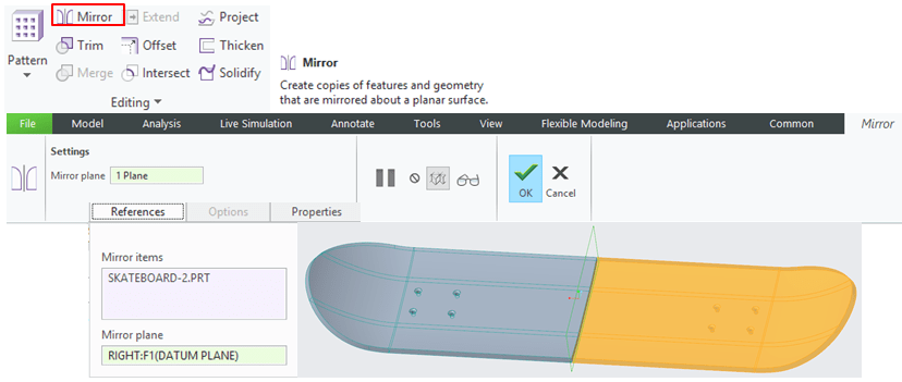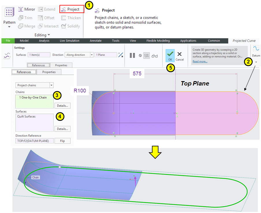 The Board is simmetical so it’s much easier to work on half side and when all the elements are in place you can mirror everything. For now contunu to create features and the next one is a wireframe projection on the swept profile. In Model Workbench click on Project icon and on Top Plane sketch an Oblong or as Creo name it Racetrack (in Palete option from Sketching tools) having a radius on 100mm and length bewetween central side points of 575mm and project this sketch on the surface as shown: