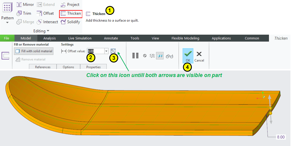 Add a thinckness of 8mm on the trimmed surface as mid-surface.