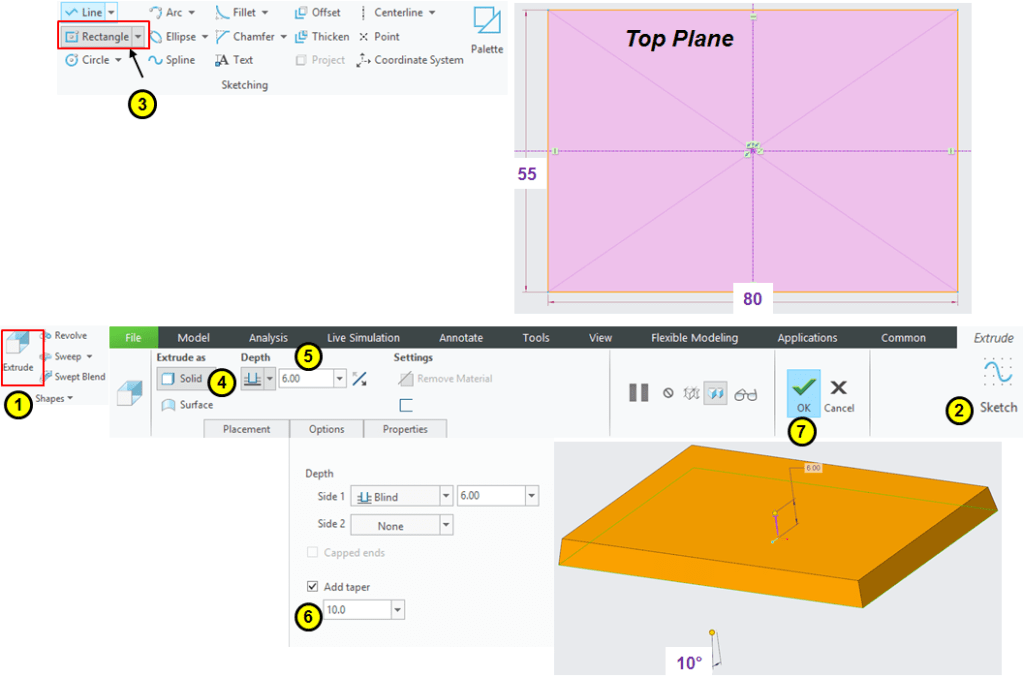Click on Extrude icon and use the Sketch option from far upper right in Extrude window to create a center rectangle of 55×80 on the Top Plane and then extrude it 6mm with a taper of 10°.