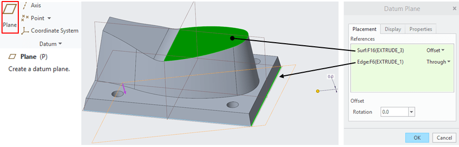 Create the Datum Plane DTM1 parallel to the Upper large surface through the bottom front edge.