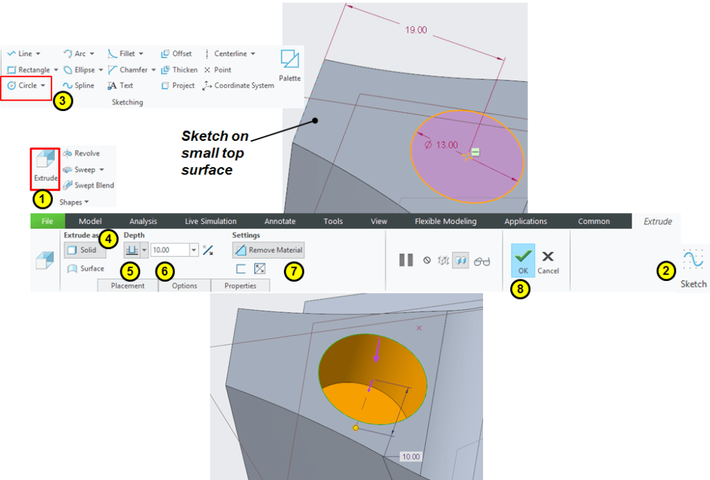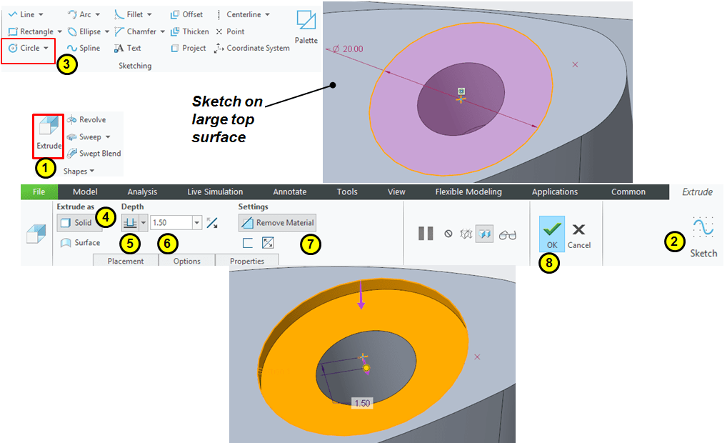 Click on Extrude icon and from Extrude window use Sketch option to draw a sketch made of arcs on Top surface and extrude it upwards with 25mm with a taper of 9°.