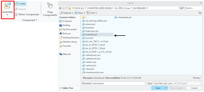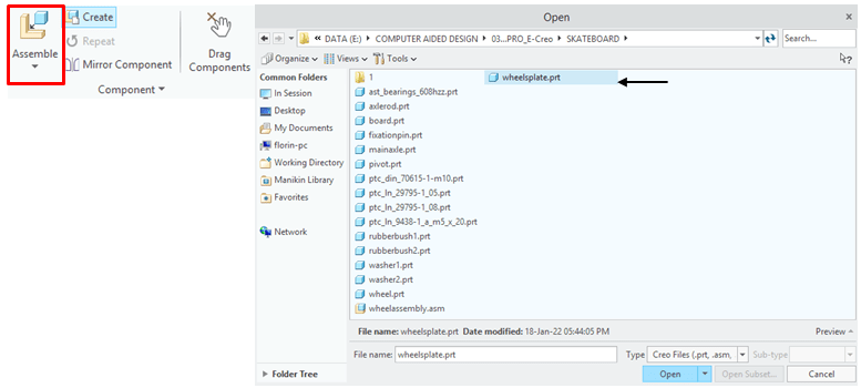 In Assemby Enviroment, click on Assemble Icon from Component ribbon, and browse for the part called Wheelplate in project folder, then click Open.