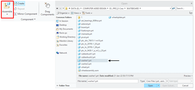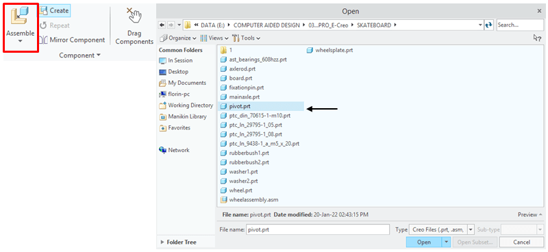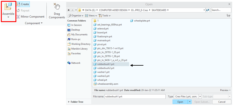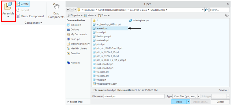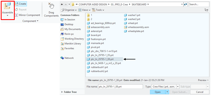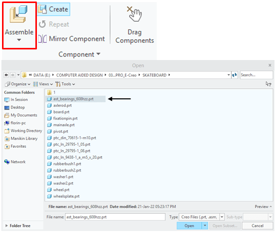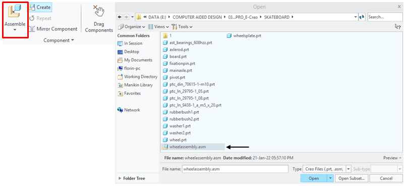 In Assemby Enviroment, click on Assemble Icon from Component ribbon, and browse for the part called Wheel in project folder, then click Open.