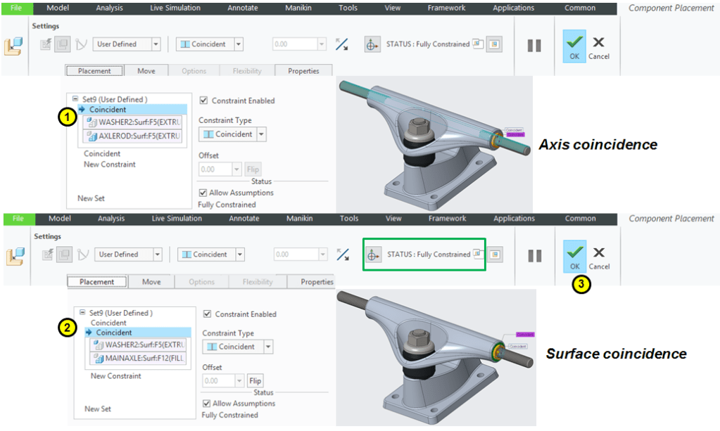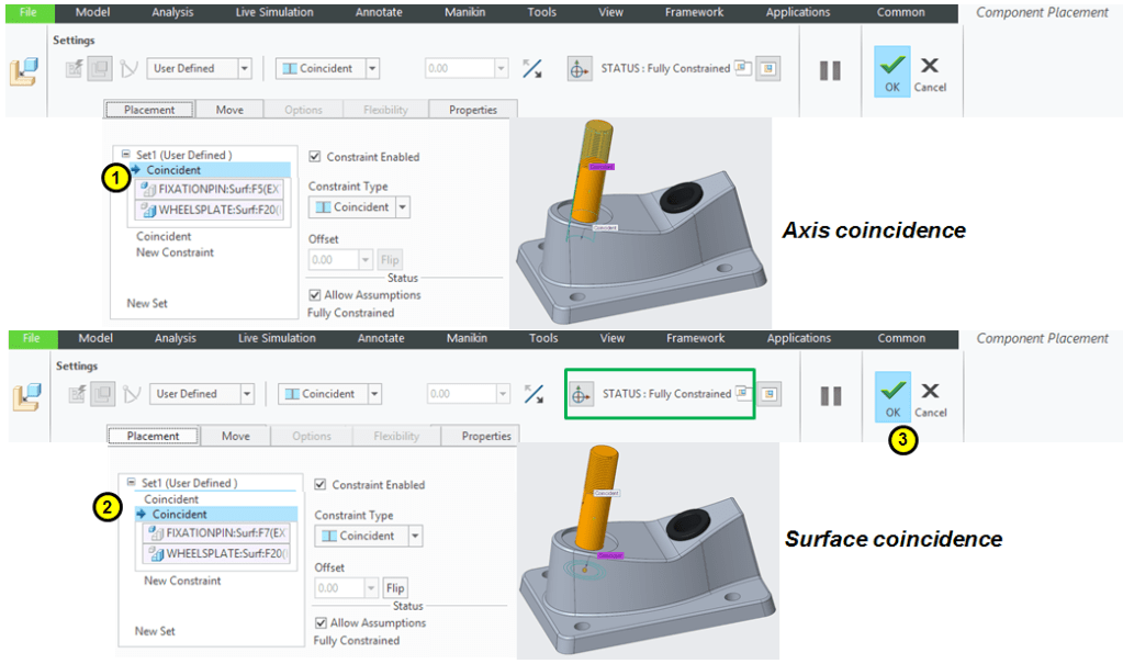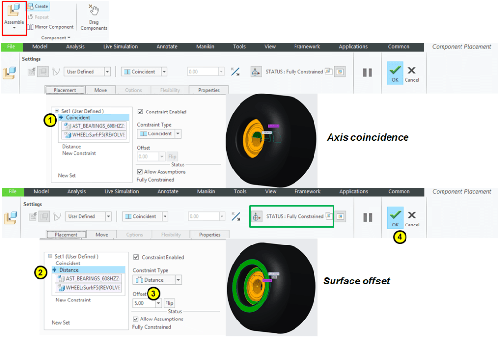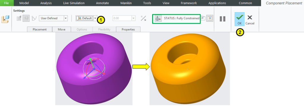 In Component Placement dialog box select the Default constraint and click OK. The Wheel is now the default reference in the assembly. Everything you add later will be refered to the Wheel position.