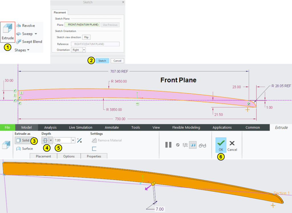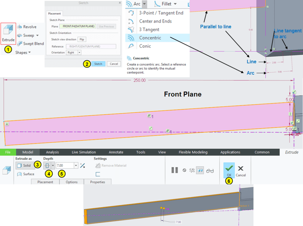 In Model Workbench click on Extrude icon and on Front plane draw the sketch as shown and extrude it by mid-plane with 7mm.