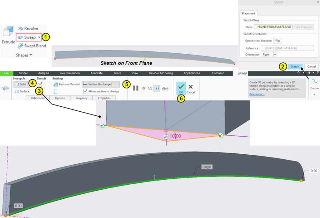 Because the Sweep is done normal to it’s trajectory as result the additional surfaces are created. In Editing ribbon, click on Remove icon and select the 2 end surfaces created by the sweep.