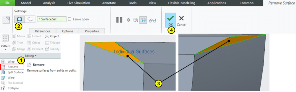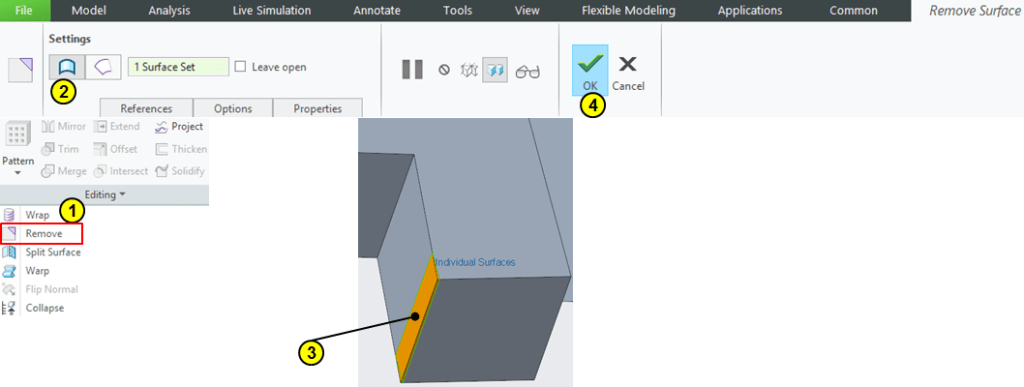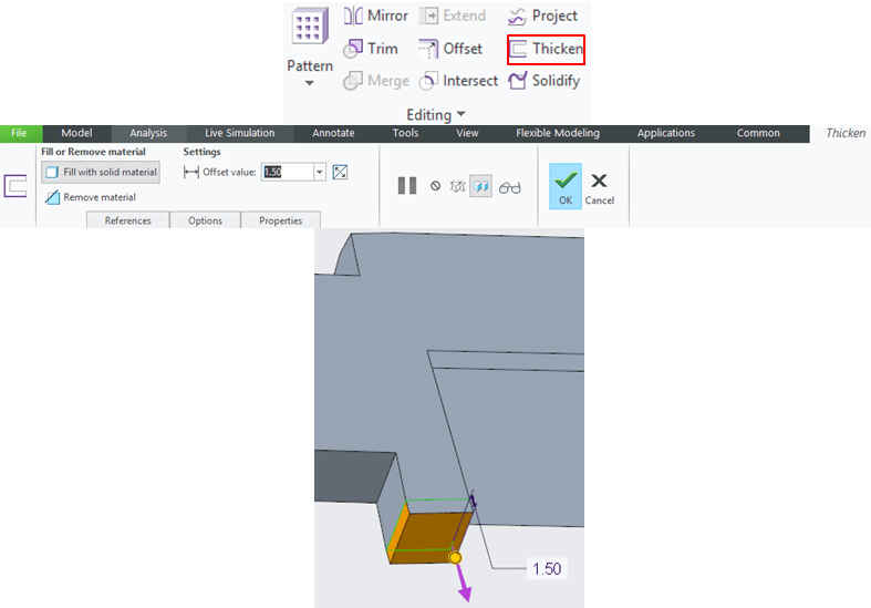 Remove the unnecessary surface created by the Thinken feature from the previous step.
