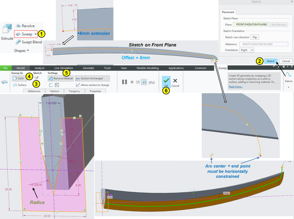 Click on Sweep icon again and on front plane create a sketch by offsetting the outer profile at 8mm inwards. Then adjust the length with 6mm on handle side and on the tip constrain the end point horizontal with the arc center. Then back in Sweep dialog box click on the sketch icon (n°3), draw the skech as shown and click OK.