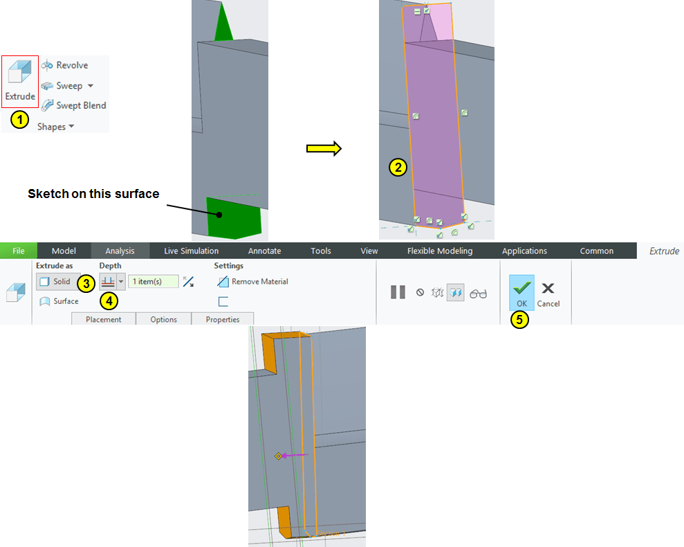 Click on Extrude icon and choose the surface available between blade and handle, sketch the shown profile and extrude it up to DTM1.