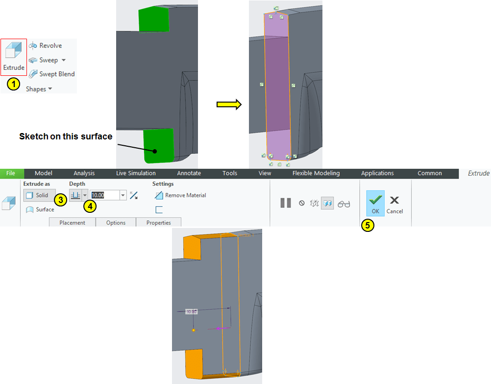 Add some extra volume on the surface between blade and handle. Click Extrude icon and sketch the profile as shown and extrude it 10mm.