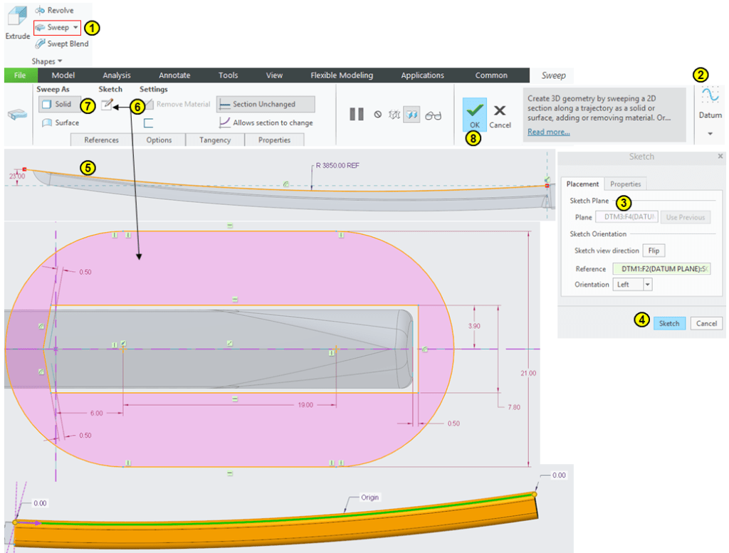 Create a sketch on the DTM3 made of a central curve as concentric arc with in the middle and add 6 datum points as shown.
