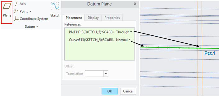 Create a new datum plane Normal to the previous sketched curve in the 1st datum point (Pct.1)