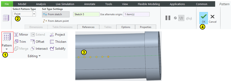 Hold the previously created Local Group selected and click on Pattern icon to multiply the feature by the remaining 5 Datum points created at STEP 6.