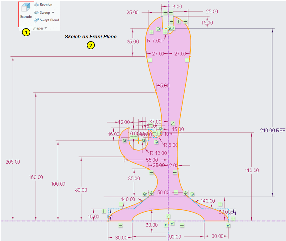 Click on Exrude icon and on Front Plane draw the following sketch: